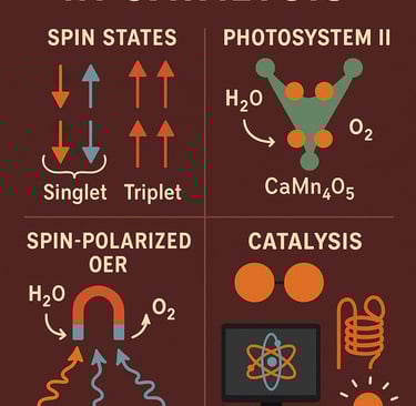 If you’ve ever wondered why splitting water into oxygen and hydrogen is so hard, the answer starts with spin, a tiny magnetic property of electrons. Water and hydroxide ions are singlet (paired-spin) species, but oxygen gas is a triplet (it has two unpaired electrons). That means making O₂ isn’t just a matter of shuffling bonds; it also requires navigating a spin change, and that makes the reaction sluggish unless the catalyst can manage the spins along the way (Cogdell & Barber, 2020; Wang et al., 2023). Electrons carry an intrinsic magnetic moment called spin. When spins pair (↑↓), we call the state singlet; when two are aligned (↑↑), we get a triplet. Because oxygen’s ground state is triplet, many oxygen-involving reactions are spin-selective—their rates depend on whether the catalyst can route electrons with the right spin alignment. For water oxidation (the oxygen evolution reaction, OER), that makes spin handling central to catalyst design (Zhou et al., 2024; Zhang et al., 2021). In plants and cyanobacteria, Photosystem II (PSII) uses a Mn₄CaO₅ (often written CaMn₄O₅) cluster—called the oxygen-evolving complex (OEC)—to turn water into O₂. It steps through five “S-states” (S₀ → S₄) in the Kok cycle, storing oxidizing power and choreographing protons, electrons, and spins until O–O bond formation occurs. Modern spectroscopy and theory have mapped spin and protonation patterns across these states, with particular attention to the penultimate S₃ state where O–O formation is primed (Suga et al., 2015; Cox & Messinger, 2013).