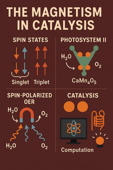 In short, spin is not a side note, it often controls the rate and selectivity in reactions that make or break O–O and C–H bonds. If a catalyst can guide electrons down the right spin pathway, it can drastically lower barriers. Nature solved it first with the Mn₄CaO₅ cluster in PSII, but synthetic catalysts are catching up. With computation, spectroscopy, and magnetic-field engineering, we are learning to control spin for catalysis—turning magnetism into a practical design knob for clean energy and green chemistry.